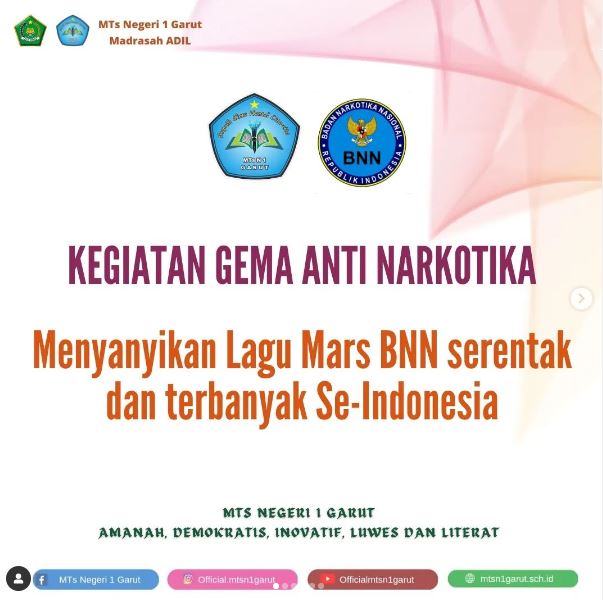 Senin, 06 Februari 2023 putra putri MTsN 1 Garut ikut serta berpartisipasi dalam Kegiatan Gema Anti Narkotika dengan menyanyikan MARS BNN serentak oleh 1250 siswa.Adapun pendamping dari BNN yakni :drg. Ervina Said Ilmi, M.KesYana Mardiyana, A.MdSALAM WAR ON DRUGS #madrasahmandiriberprestasi#madrasahAmanah,Demokratis,Inovatif,LuwesdanLitera#Suprihelmuhontalcitacita#MTsN1GarutJuara#sayn...