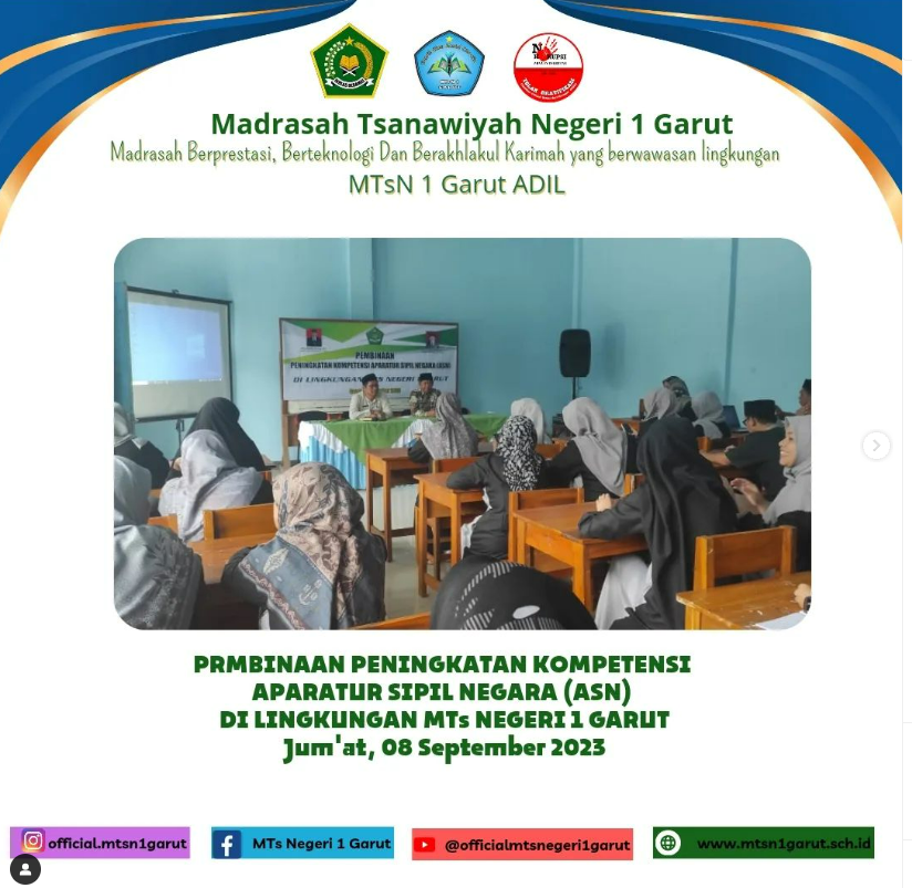 Jum'at, 08 September 2023 MtsN 1 Garut mengadakan kegiatan Pembinaan untuk meningkatkan kesdisiplinan ASN di lingkungan madrasah, yang pada kesempatan tersebut langsung dipimpin oleh Bapak Kepala Kantor Kementerian Agama Kabupaten Garut, yakni Bapak H. Saepulloh. pada kesempatan terebut beliau mengungkapkan bahwa Peningkatan kompetensi Aparatur Sipil Negara (ASN) merupakan...