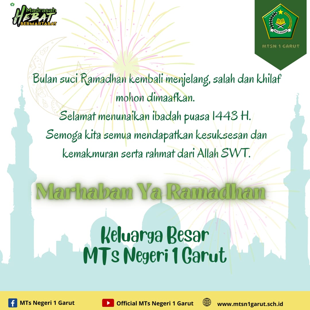 Bulan Ramadhan tak hanya tuk berpuasa, tapi juga bulan berbagi, membantu yang membutuhkan, menjaga lisan kita dan saling memaafkan. Ramadhan bagai bunga langka yang mekar setahun sekali. Ketika mulai mencium aromanya, ia menghilang satu tahun lagi. Semoga keberkahan Ramadhan tahun ini selalu menyertai kita semua. Kami segenap keluarga Besar MTsN 1 Garut mengucapkan Selamat Menunaikan...