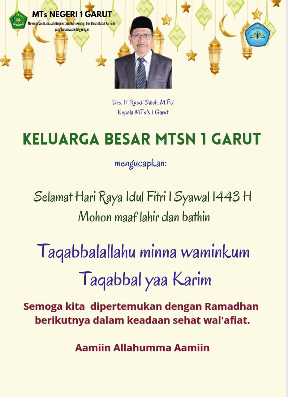 Takbir mulai bergema, menyeruak ke angkasa. Seiring datangnya kemenangan, mari kita bersama kembali pada fitrah. Dengan segala kerendahan hati, kami beserta keluarga Besar MTs Negeri 1 Garut memohon maaf lahir dan batin atas segala khilaf dan kesalahan selama ini. Selamat Hari Raya Idul Fitri 1443 H. Taqabbalallahu minna wa minkum. Mohon maaf lahir dan batin.