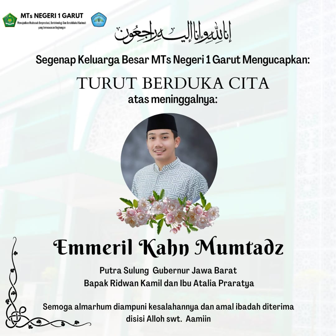 Kami keluarga besar MTsN 1 Garut turut berdukacita dan menyampaikan belasungkawa atas meninggalnya putra Gubernur Jawa Barat Ridwan Kamil, Emmeril Kahn Mumtadz atau A Eril. Innalillahi wa inna ilaihi rooji'un.. Semua akan kembali kepada-Nya... Maut tak mengenal waktu, Maut tak mengenal Usia, Maut tak mengenal tempat... Khusnul hotimah nak.. Semoga amal ibadah serta semua kebaikan...