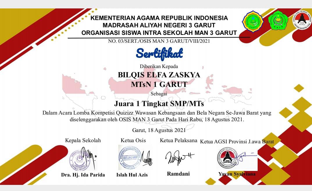 Pada ajang Kompetisi Sains Madrasah Online (KSMO) yang digelar beberapa waktu lalu, siswa Madrasah Tsanawiyah Negeri (MTsN) 1 Garut, berhasil meraih juara Harapan III pada tangkai cabang lomba Mata Pelajaran IPA,. Atas keberhasilan itu keluarga MTsN 1 Garut langsung menyambut hangat dan mengapresinya,“Alhamdulillah, siswa kita berhasil meraih Juara Harapan III dari tan...